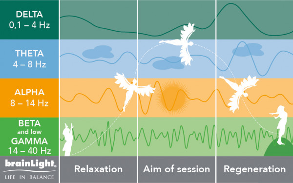 Eine brainLight®-Entspannungsanwendung beginnt in der Regel im Bereich der unteren Beta-Frequenzen. Von hier aus geht die Reise weiter in den oberen und unteren Alpha-Bereich zu einer sanften Harmonisierung. Im Bereich der Theta- und Delta-Frequenzen finden dann Tiefenentspannung und Regeneration statt.